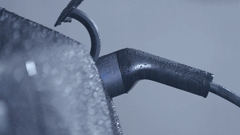 雨雪天气可能导致密封等级不高的充电桩进水,严重可导致漏电或短路,从而引发触电、火灾。在本次测试中,使用高压水枪模拟一场暴雨,对正在充电状态的无极Pro进行冲刷持续3分钟。此时,观察充电口和后台的检测数据,没有发生任何异常情况,充电桩稳定运行,通过测试。